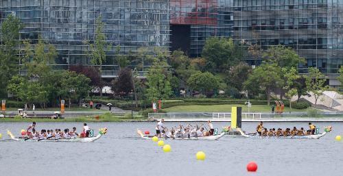 划龙舟10人座500米半决赛在成都兴隆湖湖滨赛场举行。新华社记者 王翔 摄